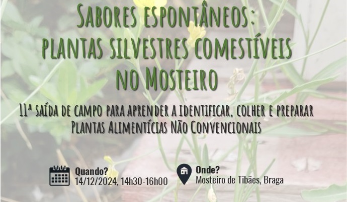 A décima primeira sessão da série de saídas de campo “Sabores espontâneos: plantas silvestres comestíveis na Cerca do Mosteiro de Tibães” irá decorrer no dia 14 de dezembro (sábado), às 14h30, na Cerca do Mosteiro de São Martinho de Tibães. A sessão será dinamizada por Daniela Valente e Denis Bertet e terá a duração de 1h30. Nesta saída de campo, que incluirá uma degustação selvagem, aprenderemos a identificar e a colher as plantas silvestres comestíveis no seu habitat, bem como a prepará-las, g [...]