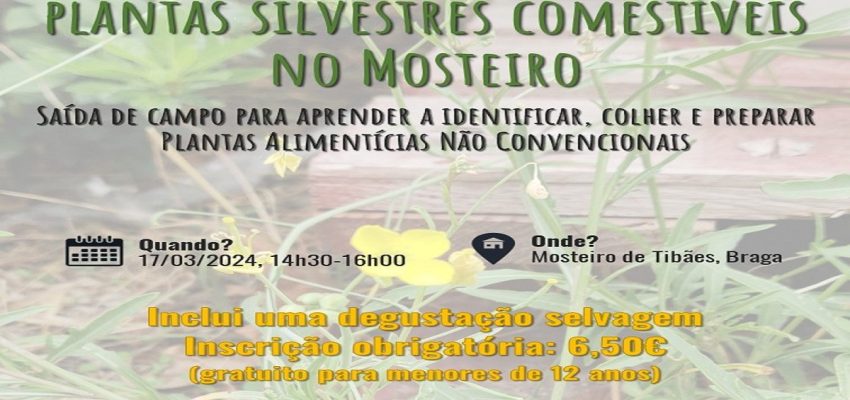 A próxima sessão da série de saídas de campo “Sabores espontâneos: plantas silvestres comestíveis na Cerca do Mosteiro de Tibães” irá decorrer no dia 17 de março de 2024 (domingo), às 14h30, na Cerca do Mosteiro de São Martinho de Tibães. A sessão será dinamizada por Daniela Valente e Denis Bertet e terá a duração de 1h30. Nesta saída de campo aprenderemos a identificar e a colher as plantas silvestres comestíveis no seu habitat, bem como a prepará-las corretamente, garantindo a nossa segurança e a sustentabilidade ambiental.