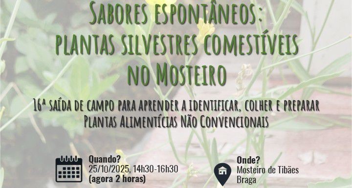 A saída de campo “Sabores espontâneos: plantas silvestres comestíveis na Cerca do Mosteiro de Tibães” irá decorrer no dia 25 de outubro (sábado), às 14h30, na Cerca do Mosteiro de São Martinho de Tibães. A sessão será dinamizada por Daniela Valente e Denis Bertet e, a partir de outubro, passará a ter uma duração de 2h. Nesta saída de campo, que incluirá uma degustação selvagem, aprenderemos a identificar e a colher as plantas silvestres comestíveis no seu habitat, bem como a prepará-las, garantindo a sua própria segurança e a sustentabilidade do meio ambiente
