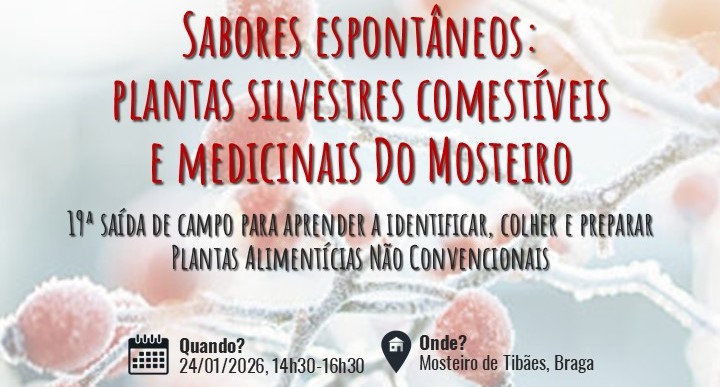 A saída de campo “Sabores espontâneos: plantas silvestres comestíveis na Cerca do Mosteiro de Tibães” irá decorrer no dia 24 de janeiro (sábado), às 14h30, na Cerca do Mosteiro de São Martinho de Tibães. A sessão será dinamizada por Daniela Valente e Denis Bertet, do projeto de botânica culinária Sabores Espontāneos, e terá uma duração de 2h. Nesta saída de campo, que incluirá uma degustação selvagem, aprenderemos a identificar e a colher as plantas silvestres comestíveis no seu habitat, bem como a prepará-las, garantindo a sua própria segurança e a sustentabilidade do meio ambiente