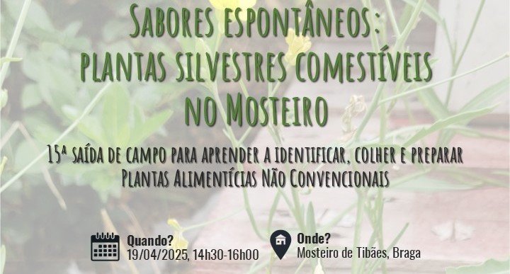 A décima quinta sessão da série de saídas de campo “Sabores espontâneos: plantas silvestres comestíveis na Cerca do Mosteiro de Tibães” irá decorrer no dia 19 de abril (sábado), às 14h30, na Cerca do Mosteiro de São Martinho de Tibães. A sessão será dinamizada por Daniela Valente e Denis Bertet e terá a duração de 1h30. Nesta saída de campo, que incluirá uma degustação selvagem, aprenderemos a identificar e a colher as plantas silvestres comestíveis no seu habitat, bem como a prepará-las, garantindo a sua própria segurança e a sustentabilidade do meio ambiente