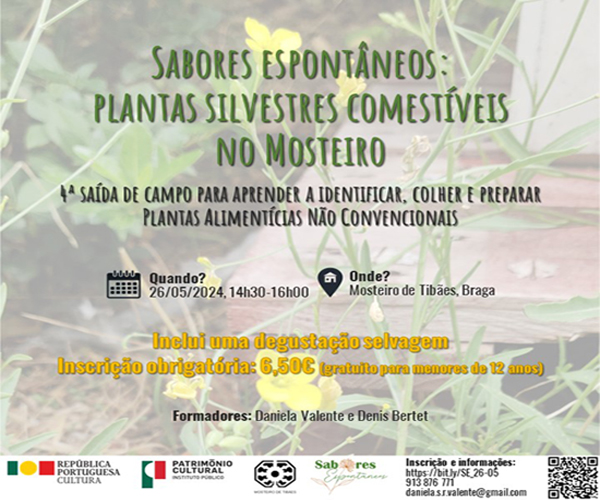 A quarta sessão da série de saídas de campo “Sabores espontâneos: plantas silvestres comestíveis na Cerca do Mosteiro de Tibães” irá decorrer no dia 26 de maio de 2024 (domingo), às 14h30, na Cerca do Mosteiro de São Martinho de Tibães. A sessão será dinamizada por Daniela Valente e Denis Bertet e terá a duração de 1h30. Nesta saída de campo, que incluirá uma degustação selvagem, aprenderemos a identificar e a colher as plantas silvestres comestíveis no seu habitat, bem como a prepará-las, garan [...]