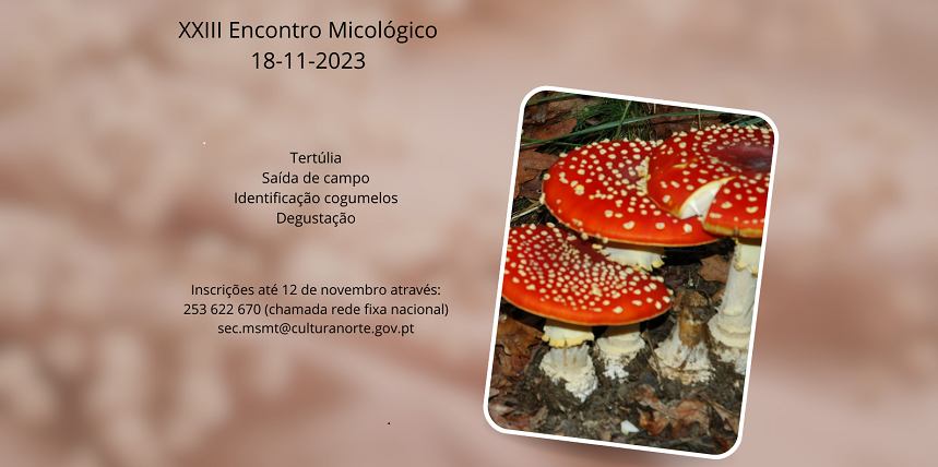 A Direção Regional de Cultura do Norte/Mosteiro de São Martinho de Tibães, com o apoio da Associação Aventura da Saúde, da Cogumeloncity, Cogumelos de Braga e da Associação Amigos de Vila Nova, promovem mais um encontro anual de micologia. Contamos consigo! Programa: 14h00 > Check-in e acolhimento dos participantes 14h15 > Orientações técnicas e práticas 14h45 > Saída de campo e outras dinâmicas 17h00 > Degustação 19h00 > Encerramento Inscrições: Os lugares são limitados. [...]