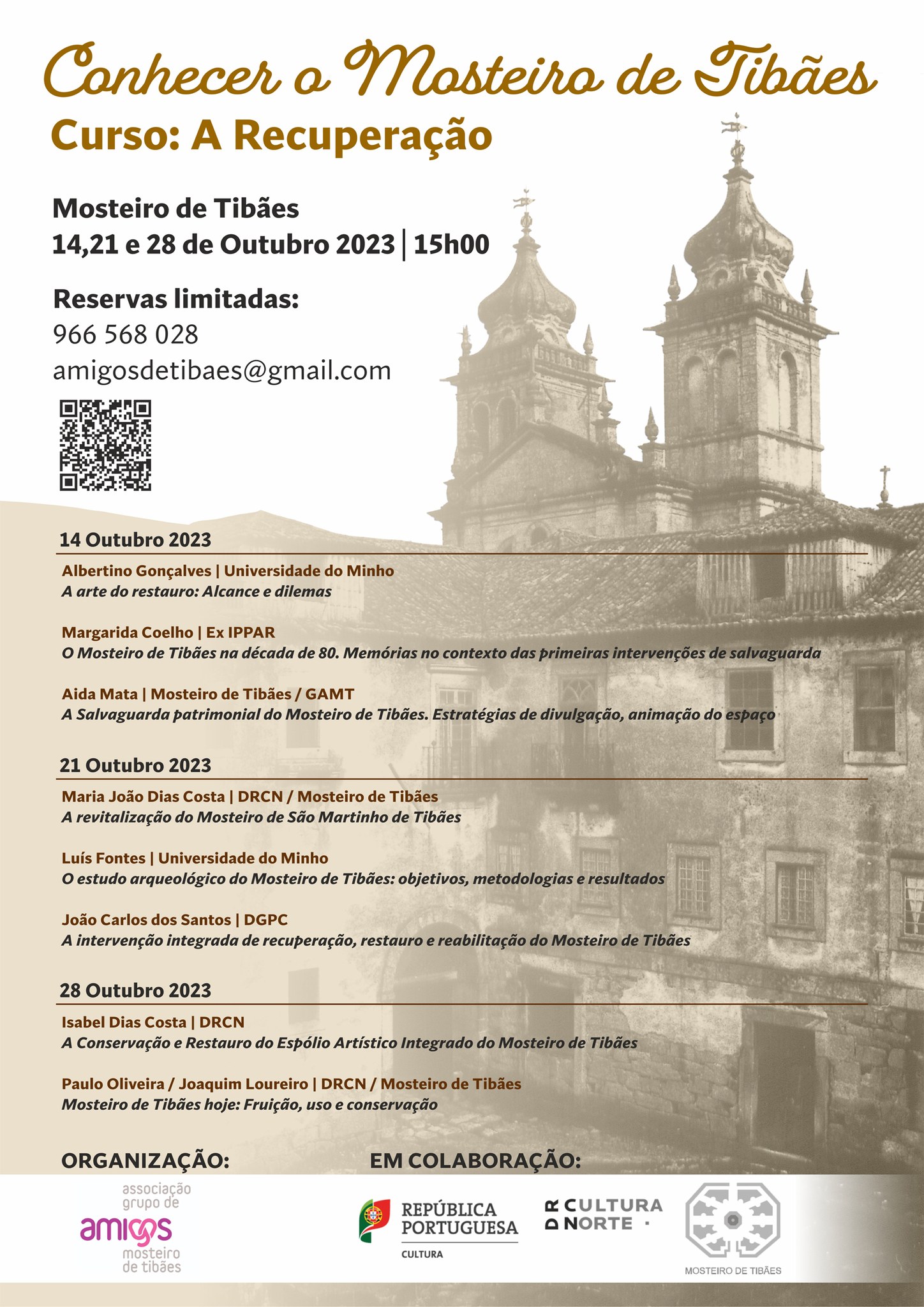 CURSO: A RECUPERAÇÃO DO MOSTEIRO DE TIBÃES: A PRESERVAÇÃO. A SALVAGUARDA. A PROTEÇÃO. A REVITALIZAÇÃO. 14,21 E 28-10-2023 Em 1986, após um longo período de denúncia pública da ruína e da negligência patrimonial que grassavam no Mosteiro de S. Martinho de Tibães, (movimento encabeçado pela ASPA, que desde 1981 vinha a travar o combate pela recuperação patrimonial do mosteiro), o Estado Português empreende a sua preservação e salvaguarda adquirindo-o e afetando-o ao Instituto Português do Patrimón [...]